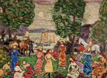 This scene of a party shows figures with hats, pets, and stylish clothes, but Prendergast did not paint facial features on his stylized figures.