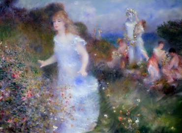 The children in this painting are celebrating springtime by decorating a statue of the Greek god, Pan, with fresh flowers.