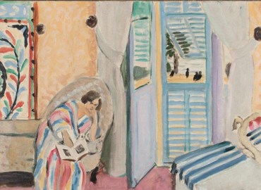 Matisse loved to paint with bright colors and bold patterns, as seen here in this scene depicting a woman reading a book in her hotel room overlooking the beach.